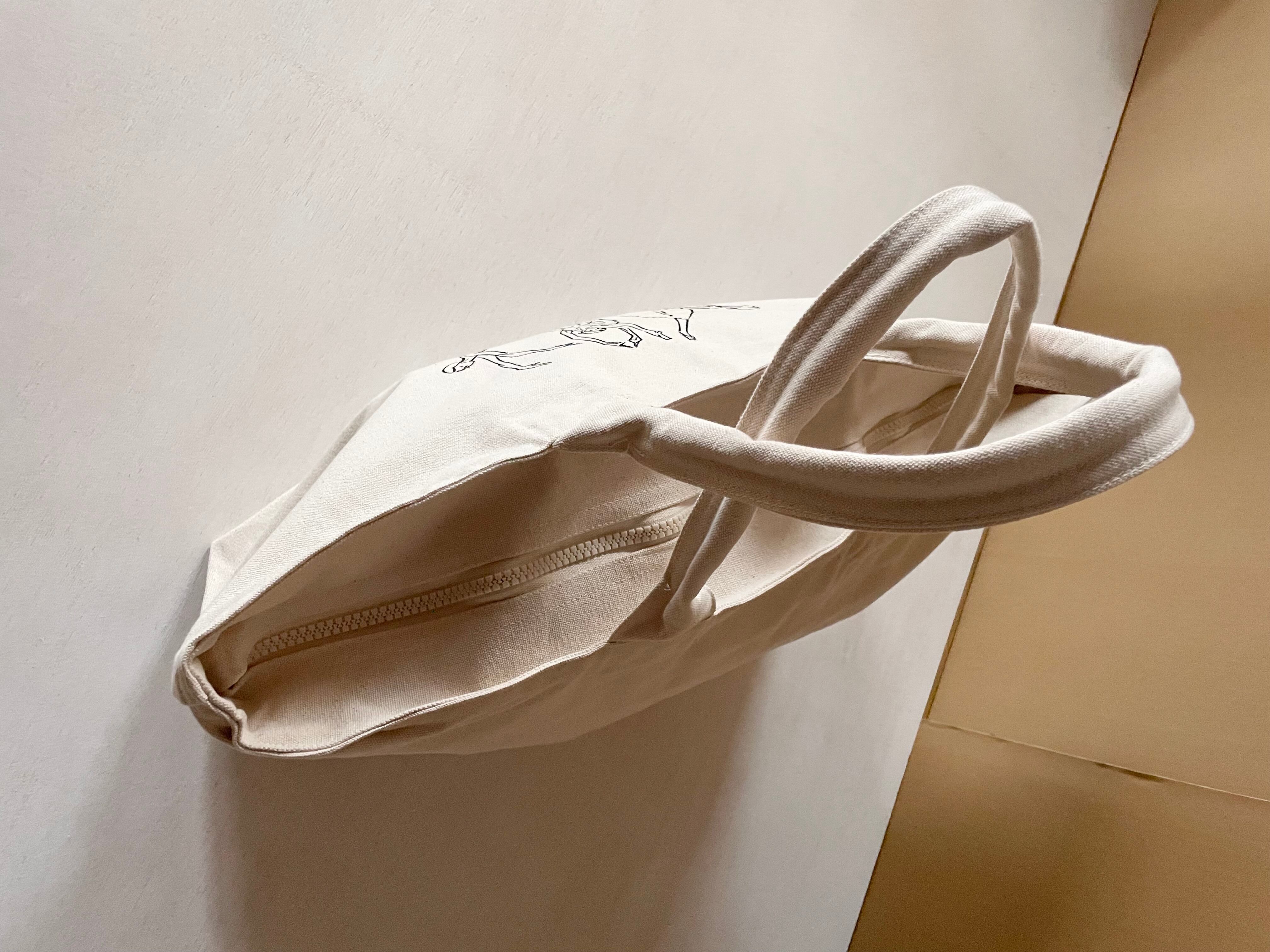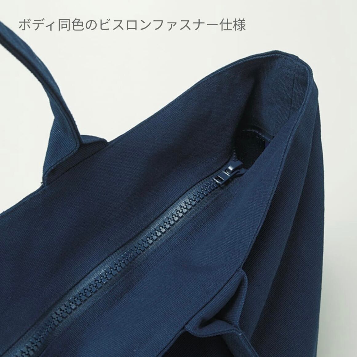 丈夫なキャンバス生地が特徴の大容量ジップトートバッグ。